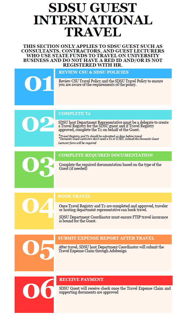 The section below only applies to SDSU guests such as Consultants, Contractors, and Guest Lecturers who use state funds to travel on university business and do not have a Red ID and/or is not registered with HR.