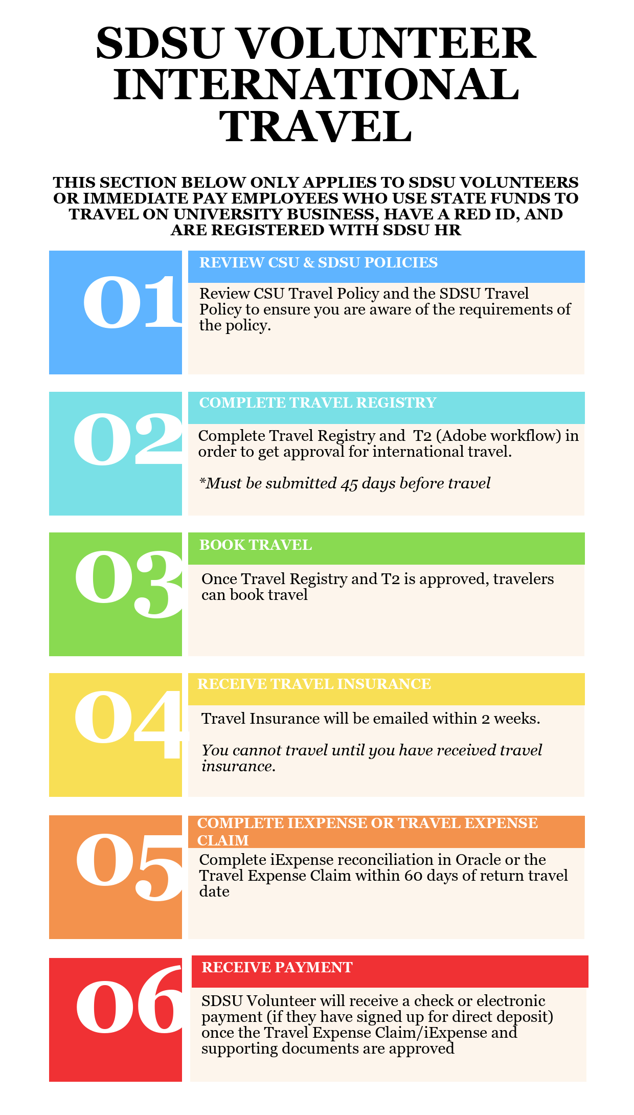 The section below only applies to SDSU volunteers or Immediate Pay Employees who use state funds to travel on university business, have a Red ID, and are registered with HR.