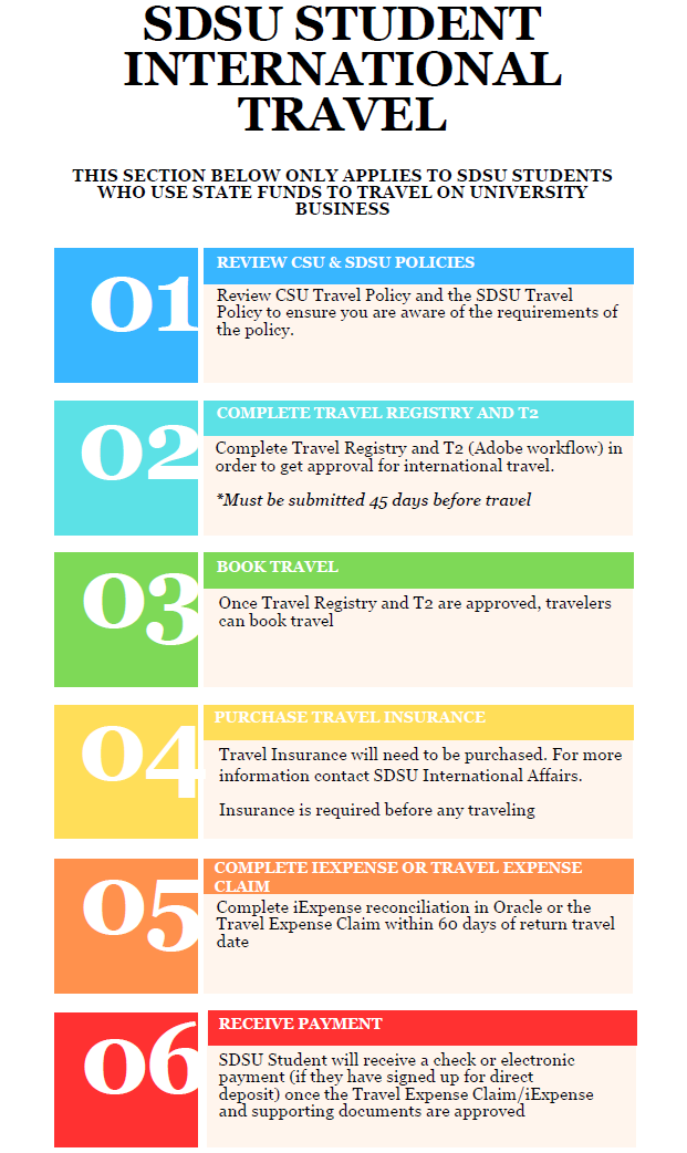 Review the CSU Travel Policy and the SDSU Travel Policy (PDF) to ensure you are aware of the policy's requirements. If you do not comply with the policy, you may not be reimbursed for your travel costs.Step 2: